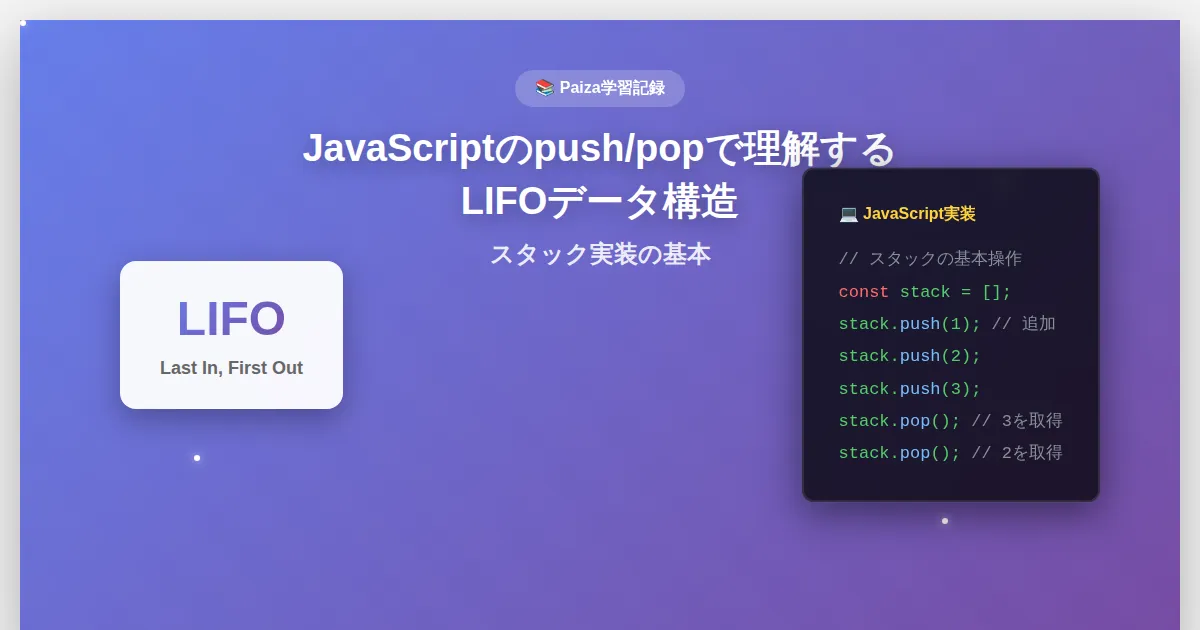 スタックは「後入れ先出し(LIFO: Last In First Out)」という特徴を持つデータ構造で、プログラミングの基本中の基本です。paizaで実際に問題を解きながら、その仕組みと実装方法を理解できました。
