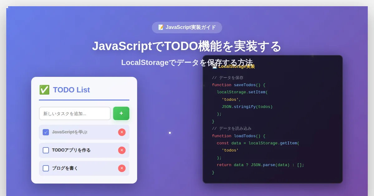 TODO機能は基本的ですが、フォーム操作、LocalStorage、配列操作、DOM操作など、JavaScriptの基礎が詰まっています。この実装を理解すれば、より複雑なアプリケーションも作れるようになります。