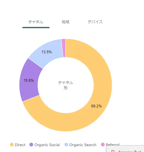DirectとSNSが中心で、検索流入はまだ少ない状況です。これは記事数やSEO対策が十分でないことが原因だと考えられます。